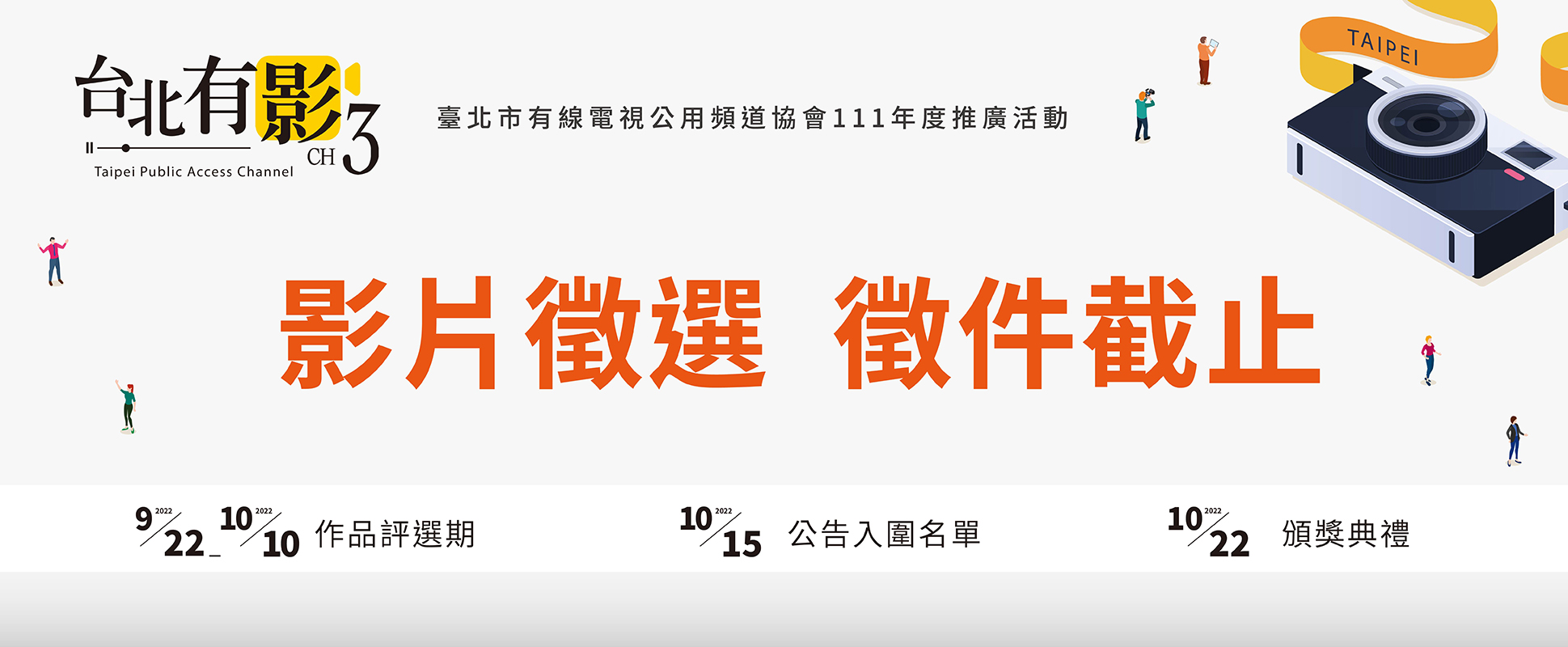 歷時三個月的「台北有影3影片徵選」活動正式報名結束,非常感謝大家的報名與支持台北市公用頻道,目前我們已經將作品整理好交棒給評審老師們進行審片中,預計將在10/15正式公告入圍名單並於10/22假內湖公民會館舉辦頒獎典禮(及臉書直播),敬請大家持續關注台北市公用頻道官網與臉書粉絲專頁。